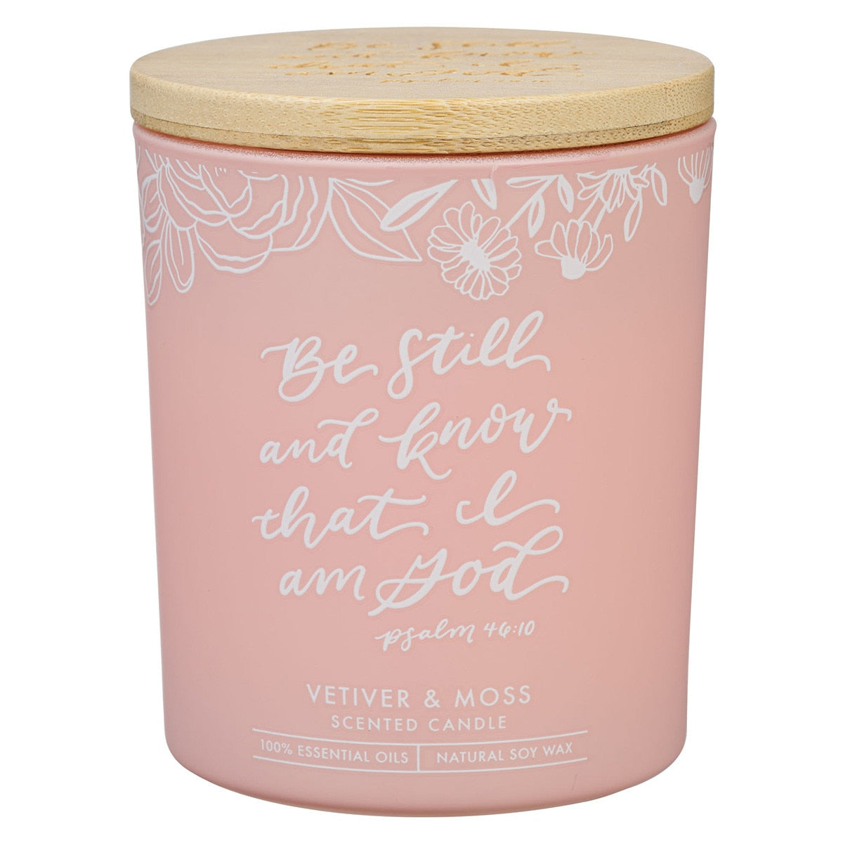 The Be Still and Know Vetiver and Moss Candle in a Glass Jar is part of the Ally Collection with artwork by Alison Loveall. This collection includes a scented candle in a glass jar, a die-cut magnet, a faux leather luggage tag, a faux leather checkbook cover, a faux leather journal, a faux leather bookmark, a spiral journal, a stainless steel tumbler, and a note-taking Bible and a gift bag.