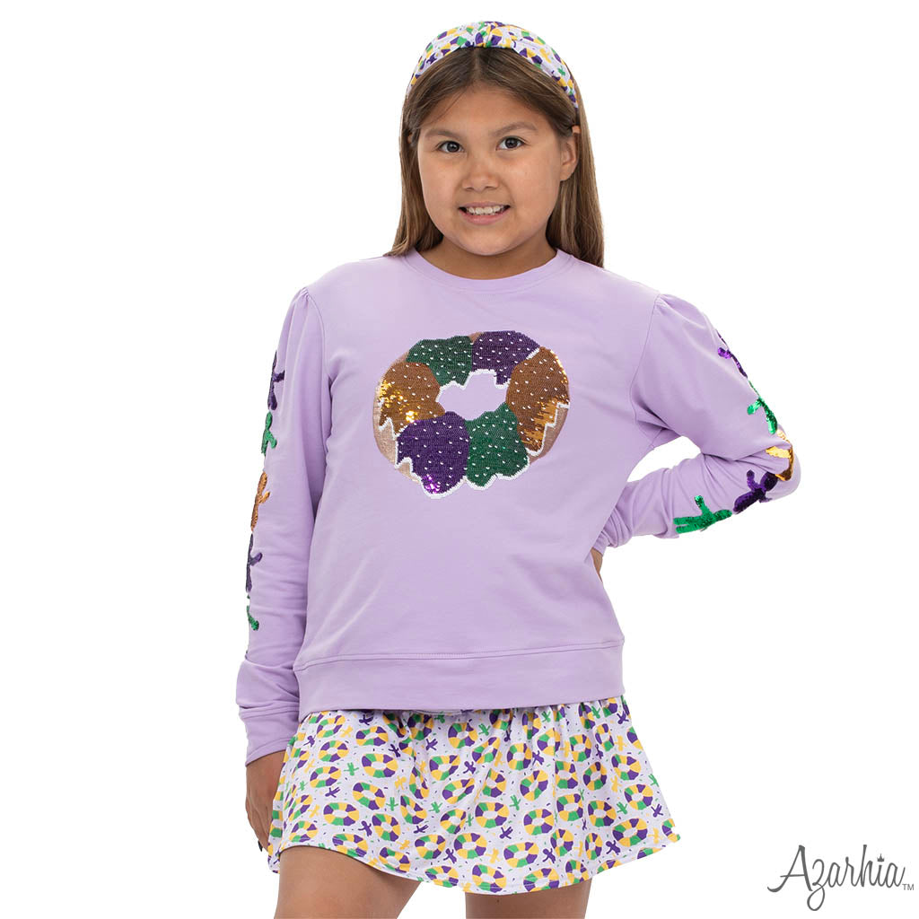 Sweet like Mardi Gras itself! This adorable lavender top features a sparkling sequin king cake front and colorful sequin baby icons dancing down each sleeve. With its bright purple, green, and gold shimmer, this festive long sleeve is perfect for parade days, school parties, or any little queen who loves to shine. Cozy, cute, and full of Carnival charm—this top is a Mardi Gras must-have! 🎭✨🍰💜