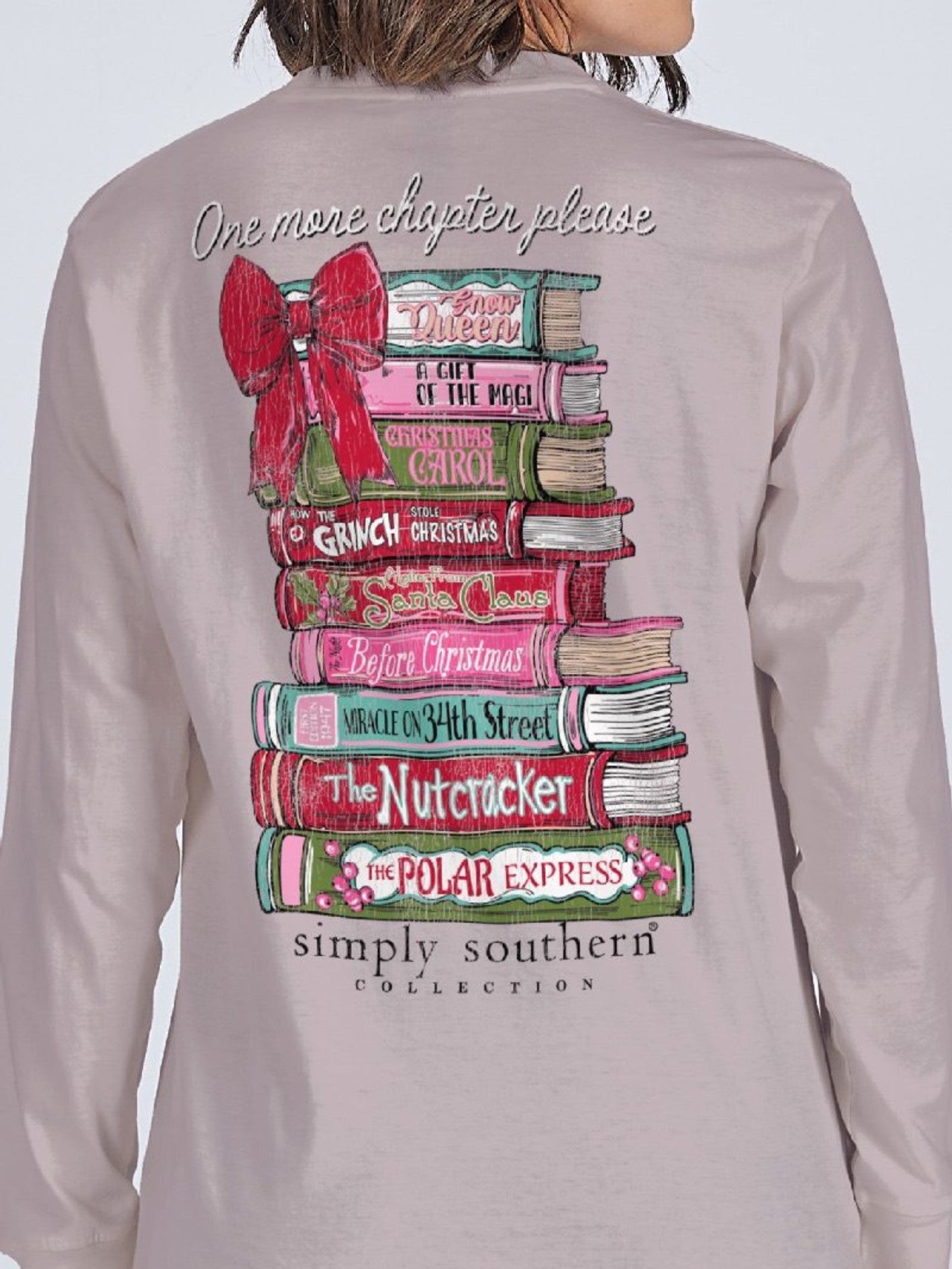Driftwood grey long sleeve shirt with the phrase 'One more chapter please' and a stack of Christmas themed books. Simply Southern logo below. Similar design on left chest.