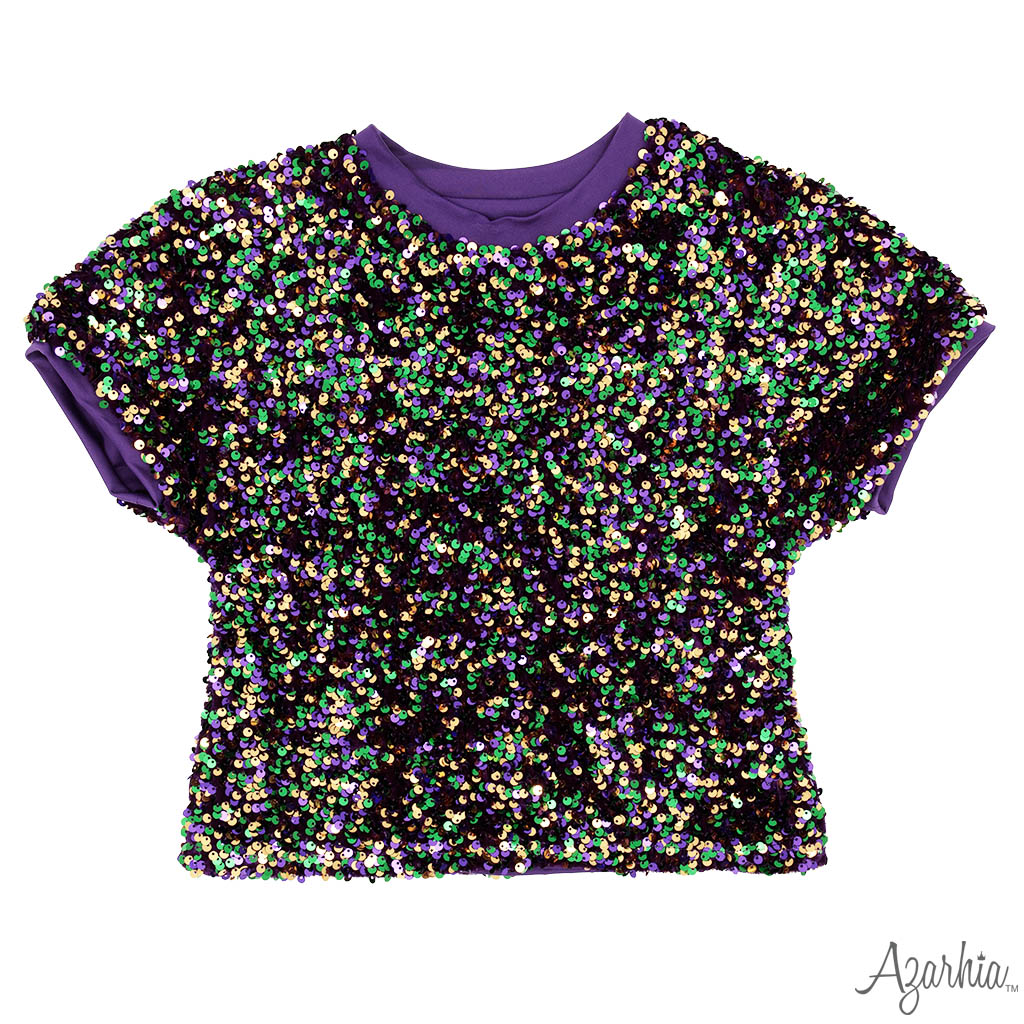 Bring sparkle to parade day with this festive boxy tee! Covered in shimmering sequins in classic Mardi Gras purple, green, and gold, it’s playful, comfy, and perfect for twirling, dancing, or showing off her Carnival spirit. Lightweight, fun, and full of shimmer—this tee is a must-have for every little Mardi Gras queen! 🎭🌟🎉