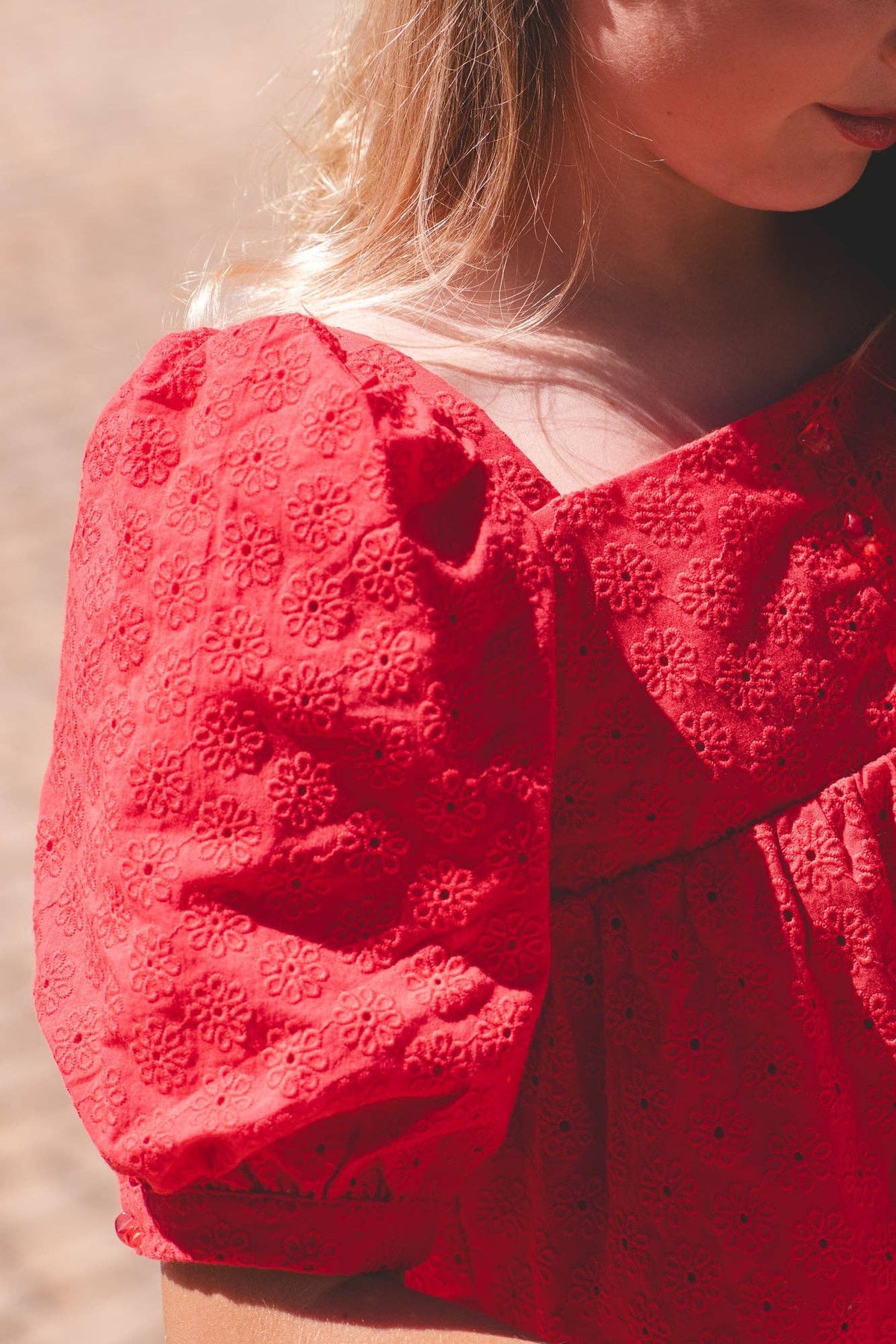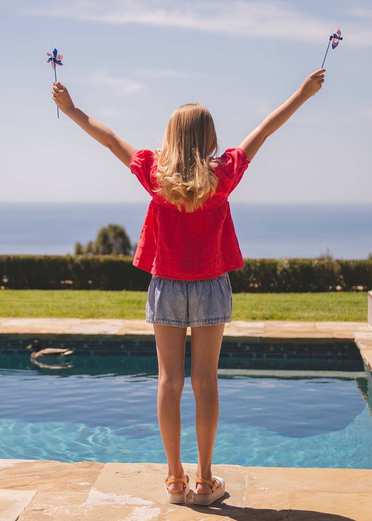 Stars, stripes, and serious style—say hello to the Strawberry Fields Top! Crafted from a breezy cotton eyelet fabric in the juiciest Strawberry Red, this fully lined beauty is picnic-perfect and party-ready. A functional button placket (yep, those are star buttons!) adds a twinkle of charm, while the functional sleeve binding keeps things comfy and cute. Whether she’s heading to a Memorial Day BBQ or dancing under the fireworks on the Fourth of July, this top makes patriotic dressing a total breeze for young girls and tweens. Style it with the Bike Ride Shorts for a cute but laid back patriotic look. Model is 4'6" wearing a size 8.