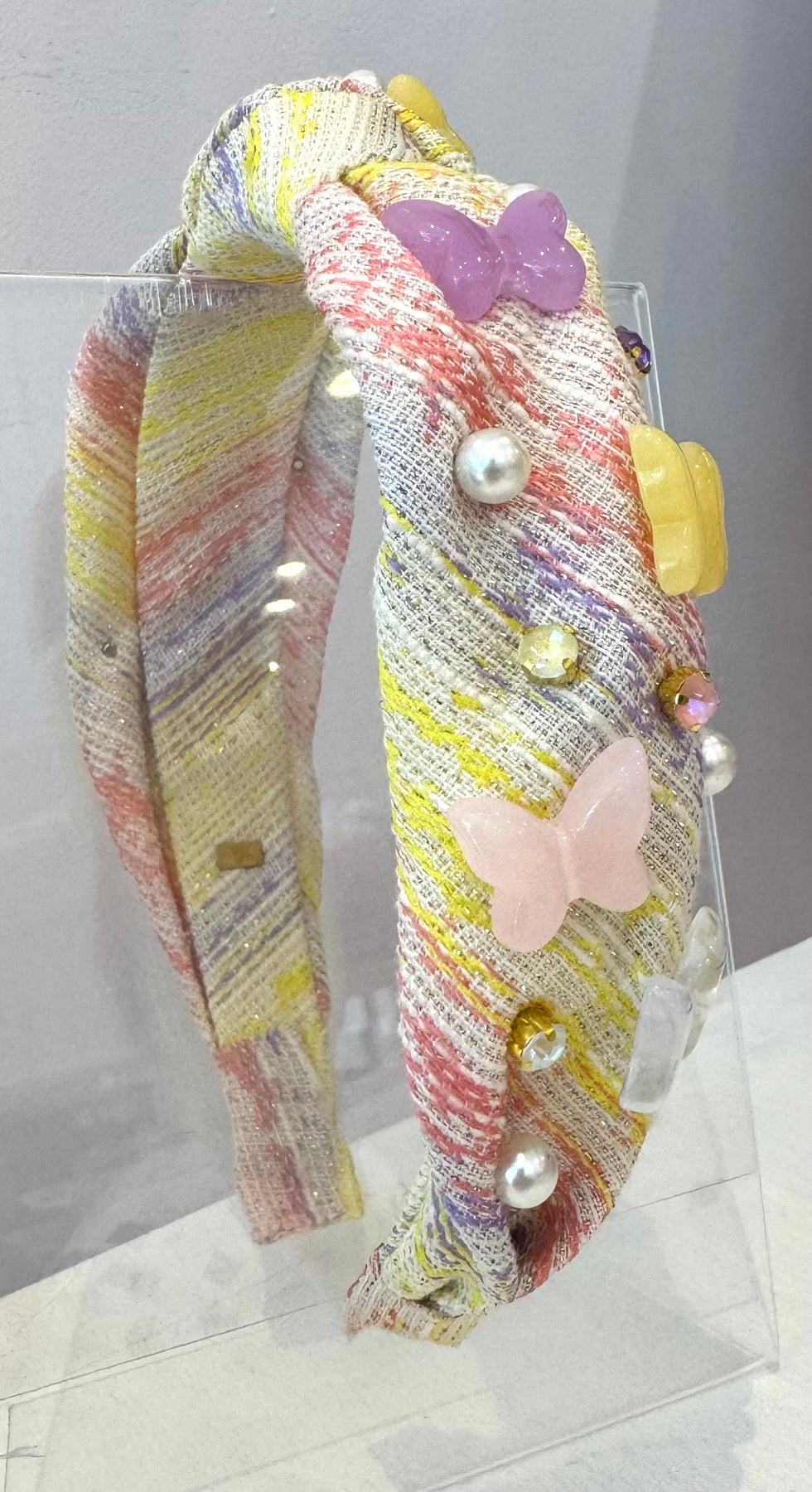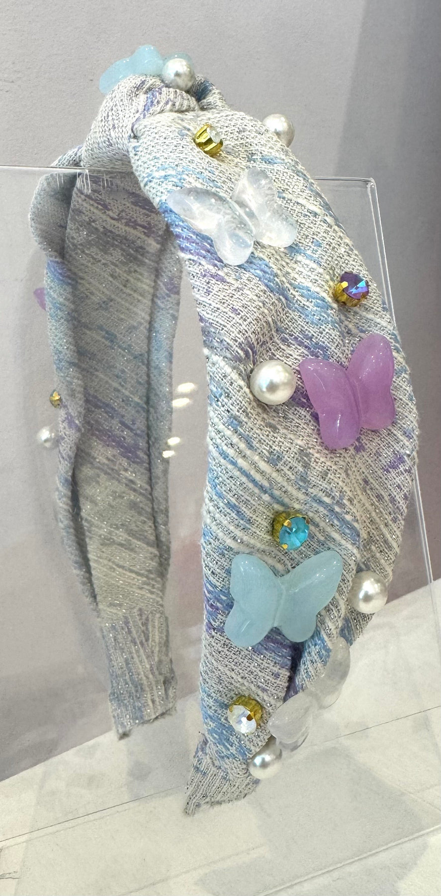 Super Cute Linen Headband With 3D Butterfly, Pearls, and Jewels. Comes in a Blue Multicolored and a Pink, Yellow, and Purple Multicolored.