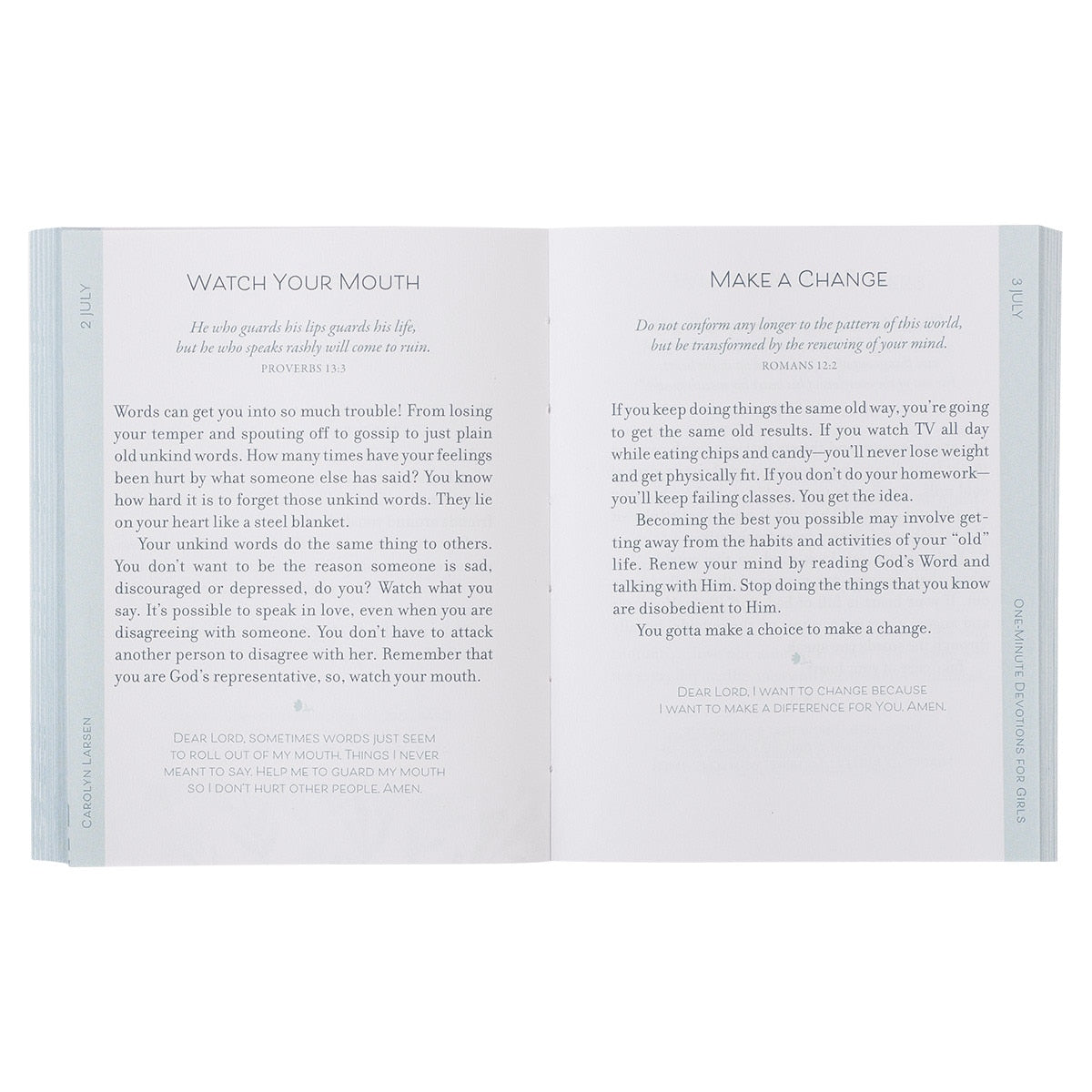 One-Minute Devotions for Girls is authored by a renowned writer of Christian books for youth, Carolyn Larsen. Carolyn has written more than 40 books for children and adults. She is best known as the author of the Little Girls & Boys Bible Storybook line of products, which have collectively sold more than one million units.