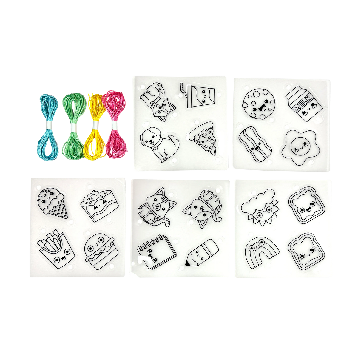 - Kit includes 20 pre-cut shrink plastic charms and 4 colored cords in blue, green, yellow and red!